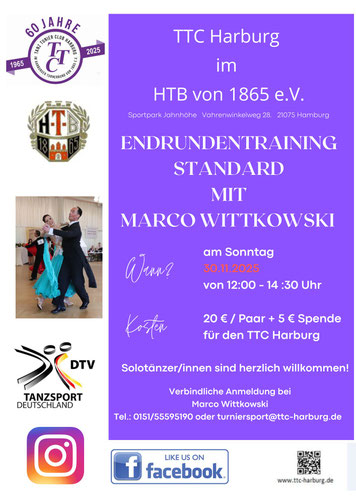 Unser Tanzsporttrainer Marco Wittkowski leitet am Sonntag, den 30.November 2025, von 12:00 – 14:30 Uhr das Endrundentraining Standard im Spiegelsaal des Sportpark Jahnhöhe. Die Kosten pro Paar betragen